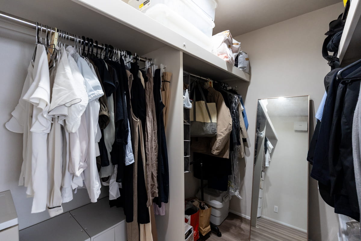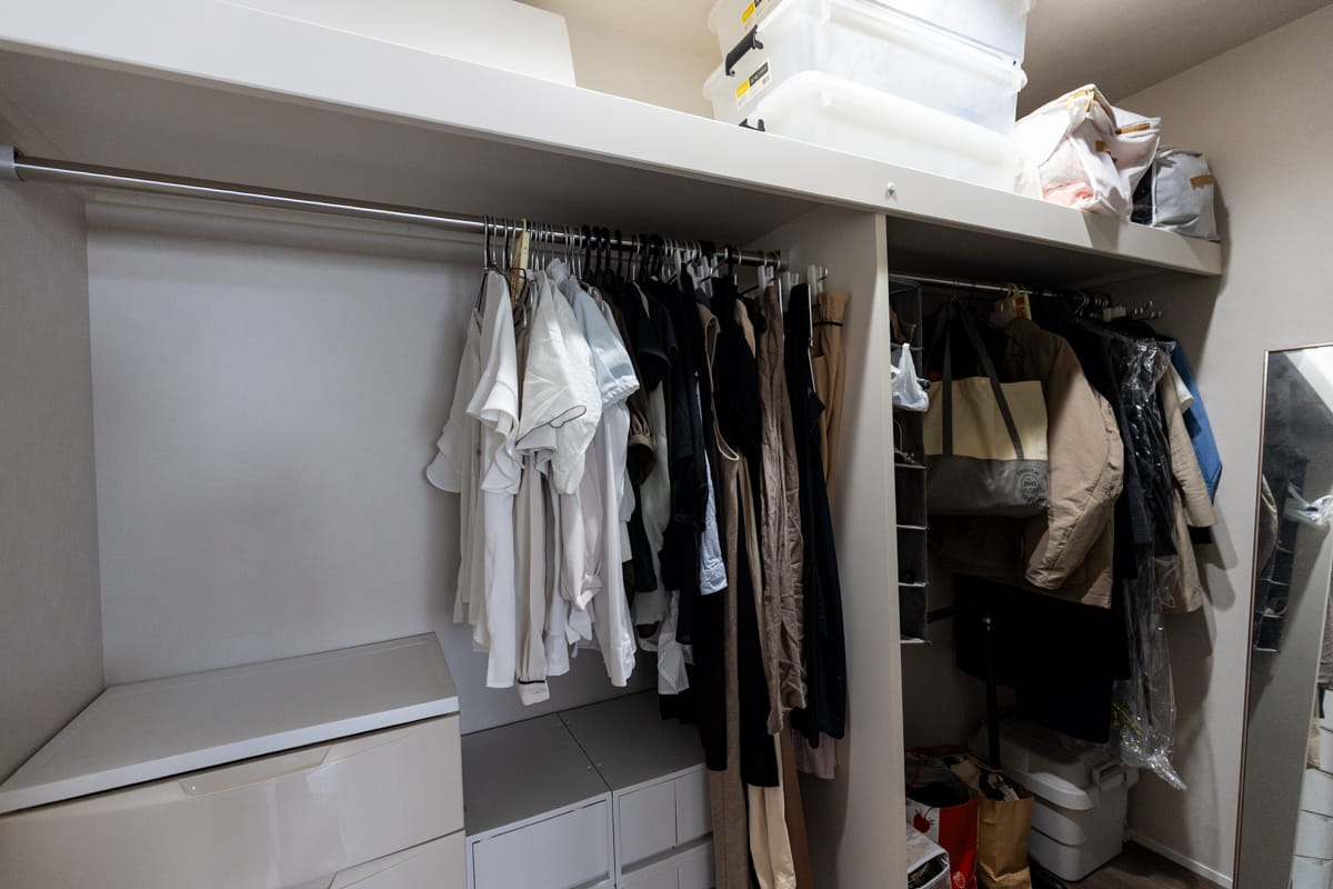 主寝室奥の広々としたウォークインクローゼットはご夫妻の衣類をまとめて収納でき、家事の時短にも役立っています。