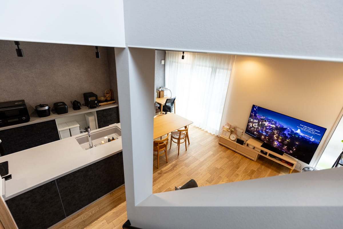 リビング階段を上がった2階は将来の子ども部屋と主寝室になっています。「キッチンに対面するように階段を設計したのは、子どもが成長して自分の部屋で過ごす時間が増えても、しっかり顔を合わせたいと思ったからです」と奥様。