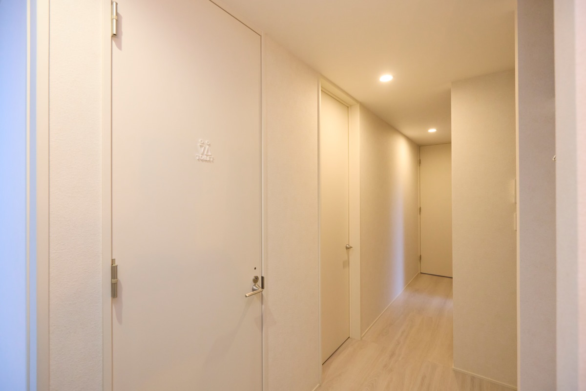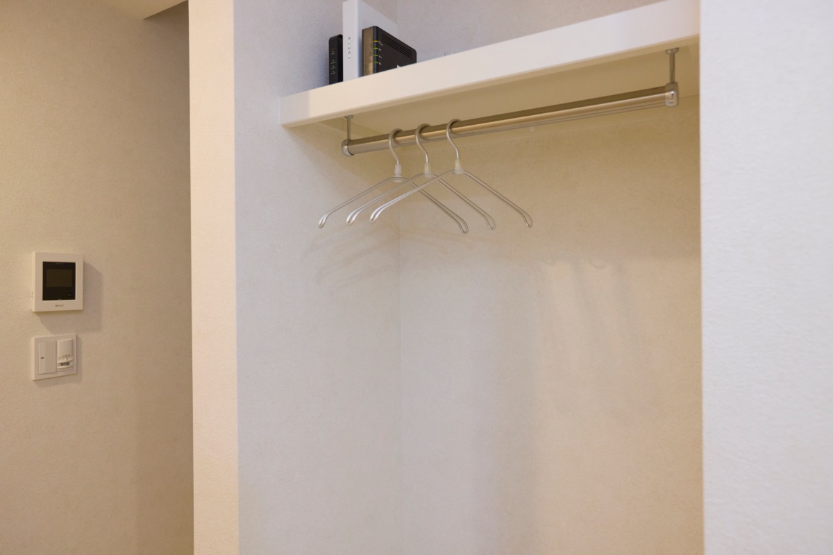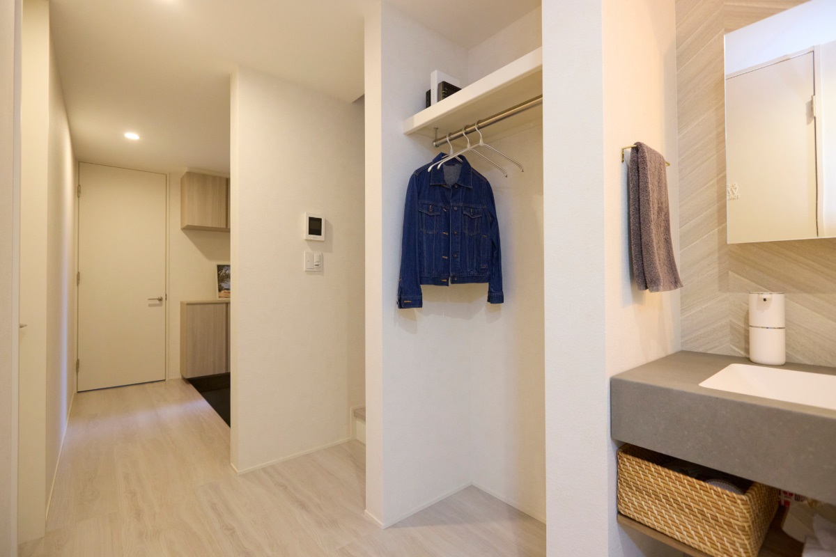 そのほかに収納関連で工夫されているものとして挙げられるのが、幅半間のコート掛け。玄関から続く廊下にある洗面台の手前に設けられており、帰宅時に上着を脱いで掛け、その流れで手を洗うというように、動線面でも考え抜かれた配置となっています。