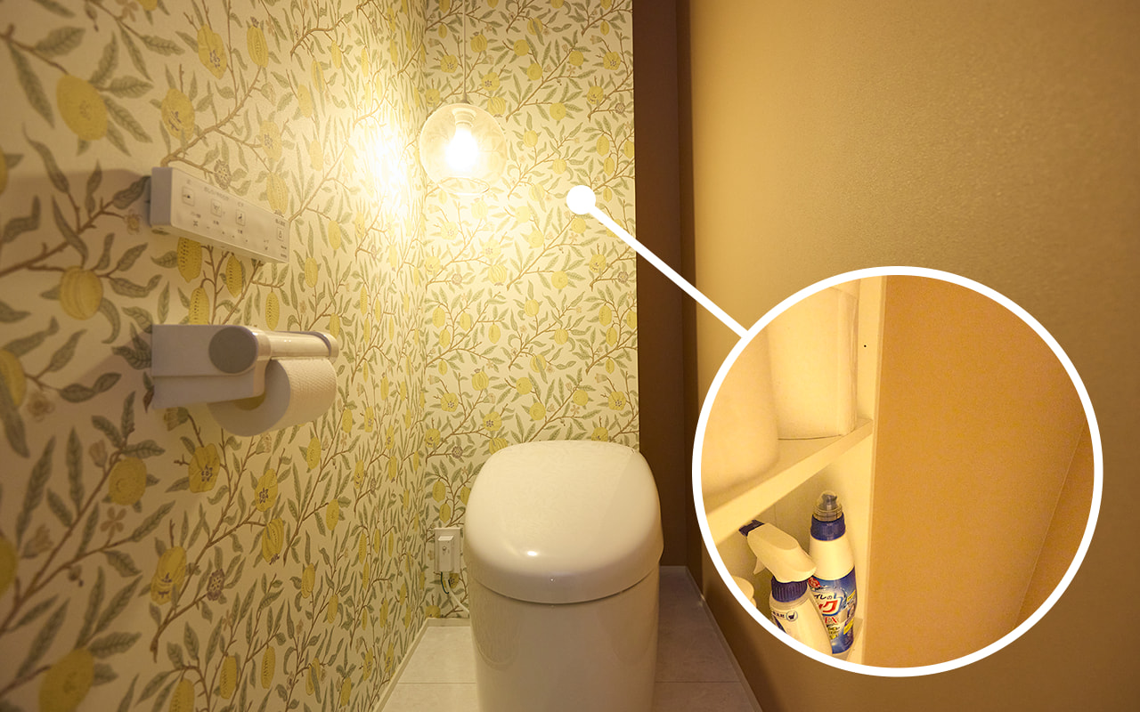 たとえば、トイレの正面。一見、花柄がおしゃれな壁だけがあるように見えますが、実はその裏が収納スペースとなっており、トイレットペーパーなどのトイレ関連の用品が人目に触れることなくスマートにしまわれています。